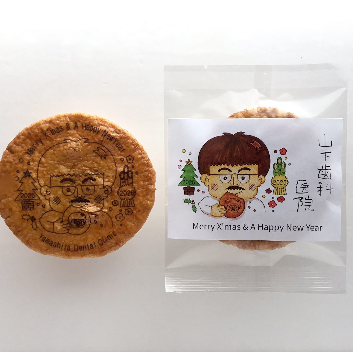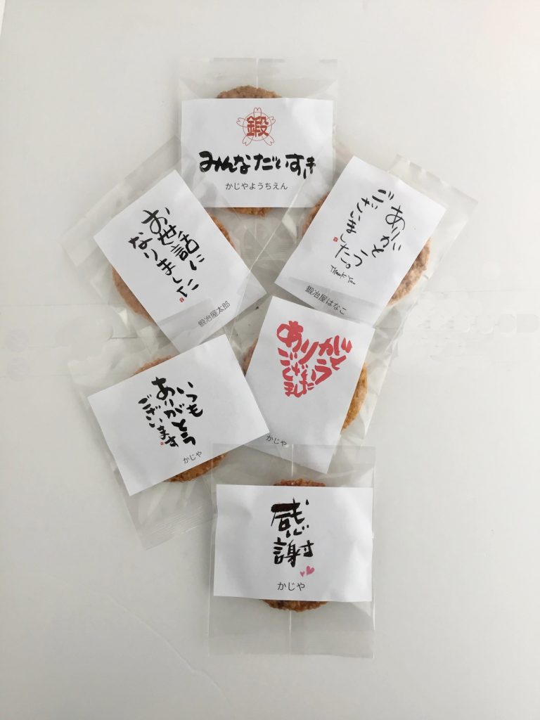 お客様ご自身で描かれたイラストやロゴ、デザインをラベルにしておせんべいにお貼りします。